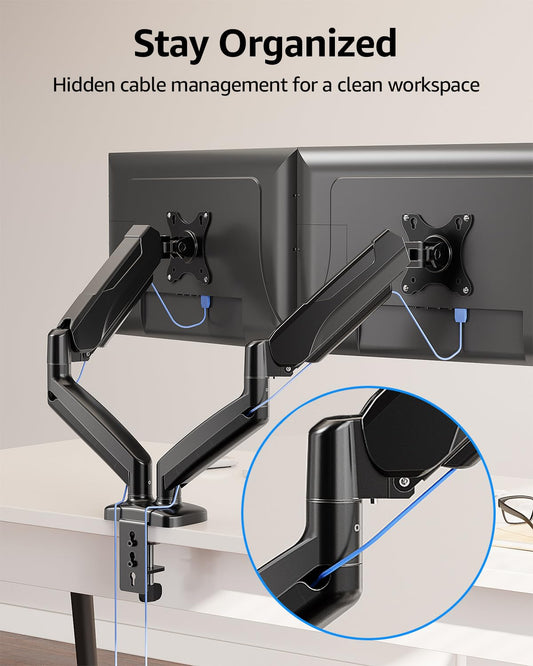 MOUNTUP Dual Monitor Stand for Desk, Pneumatic Monitor Arms for 2 Monitors Max 32 Inches, Height Adjustable Double Monitor Mount, VESA Mounts with C-Clamp & Grommet Base, Holds 4.4-17.6lbs, Black