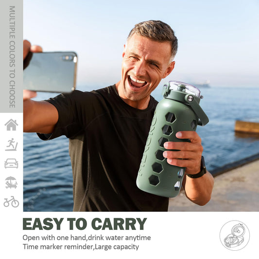 MUKOKO 64oz Glass Water Bottles with Straw, Half Gallon Water Jug with Time Marker, Sports Large Motivational Bottle with Silicone Sleeve, Olive