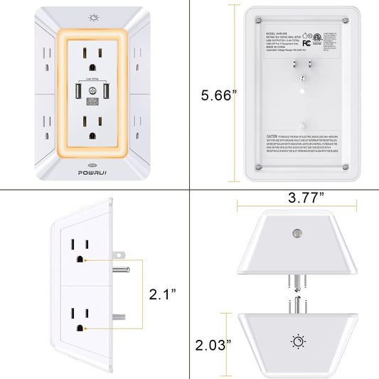Multi Plug Outlet Surge Protector - POWRUI 6 Outlet Extender with 3 USB Ports (1 USB C) and Night Light, 3-Sided Power Strip with Adapter Spaced Outlets - White, ETL Listed