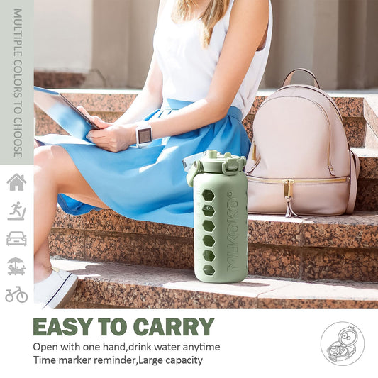 MUKOKO Half Gallon/64 oz Glass Water Bottles with Straw and Lid,Motivational Water Jug with Time Marker Reminder and Silicone Sleeve,100% Leakproof BPA Free Fitness Sports Large Bottle-Green