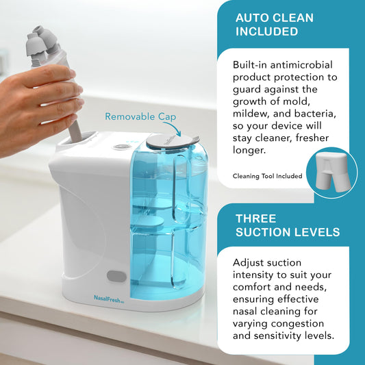 NASALFRESH MD Premium Bundle–Dual Powered Nasal Irrigation System Nasal Rinse and Wash, Sinus Decongestant Relief System, 60 Saline Packets, Case, Rechargeable, 2 Sets of Nose Pillows–Snoring Remedy