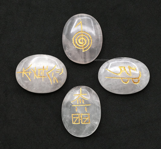 Amazing Gemstone Rose Quartz Crystal Reiki Stones with Engraved Symbols for Usui Reiki Healing, Set of 4 Pcs (Indian Handmade Reiki Gift Set)