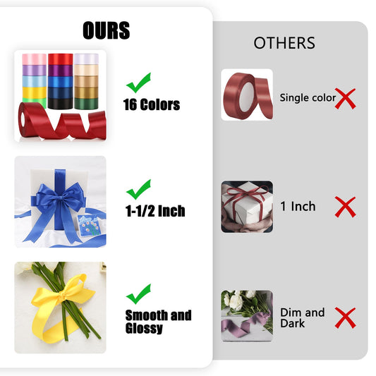 NESCCI 16 Colors 400 Yards Ribbon,1-1/2 Inch Satin Ribbon,Single Face Satin Ribbons, Perfect for Gift Wrapping, Wedding Decoration,Handmade Bows,Wrapping Bouquet and More