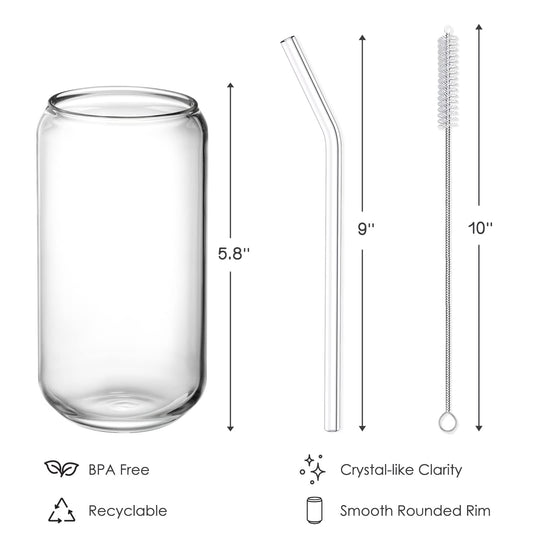 NETANY Drinking Glasses with Glass Straw 4pcs Set - 16oz Highball Glass Cups, Beer Glasses, Iced Coffee Glasses, Cute Tumbler Cup, Ideal for Whiskey, Soda, Tea, Water, Gift, 2 Brushes
