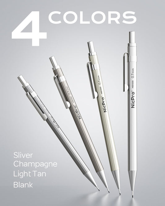 Nicpro 4 Pack Mechanical Pencil 0.7mm with Case, MB1000 Metal Mechanical Pencil Set with 6 Tube HB #2 Lead Refill 0.7 mm, 3PCS 4B Eraser, 9 Cap Eraser for Artist Drafting Writing, Sketching, Drawing