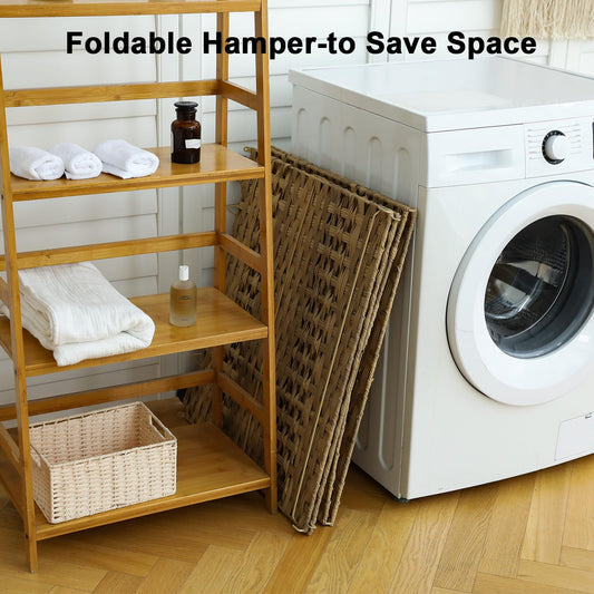 OIAHOMY Laundry Hamper with Lid, 140L Clothes Hamper with 3 Removable Liner Bags, Foldable Basket with Lid, Synthetic Wicker Laundry Basket for Bedroom, 27x 13 x 26 Inches, Yellow