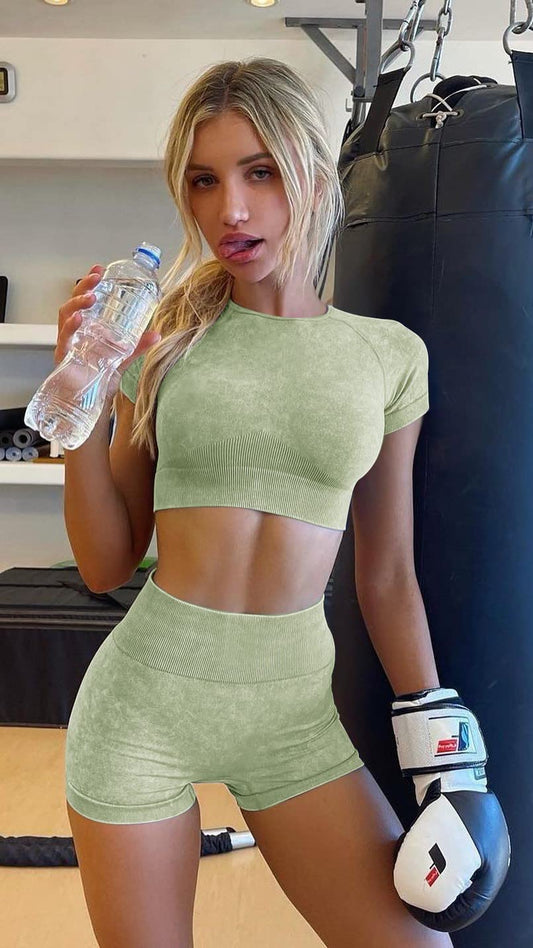 OLCHEE Womens Workout Sets 2 Piece - Seamless Acid Wash Yoga Outfits Leggings Shorts and Crop Top Matching Gym Activewear Athletic Clothing Set - Green Small