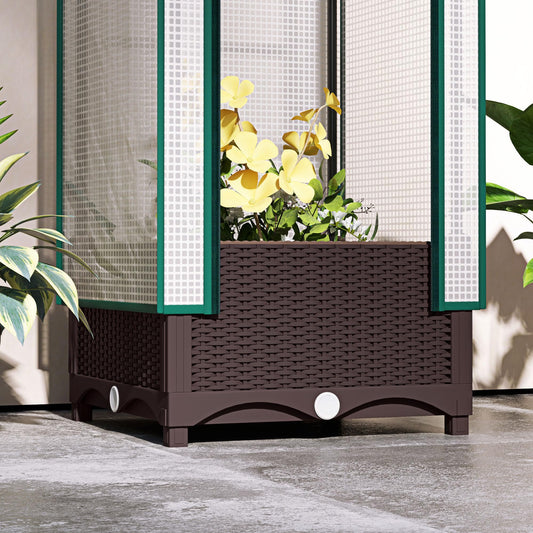 Outsunny Plastic Raised Garden Bed with Trellis, Outdoor Planter Box with PE Greenhouse Cover, Drainage Holes and Zipper Door for Climbing Plants, Herbs and Vegetables, 15.7" x 15.7" x 48.8", Brown