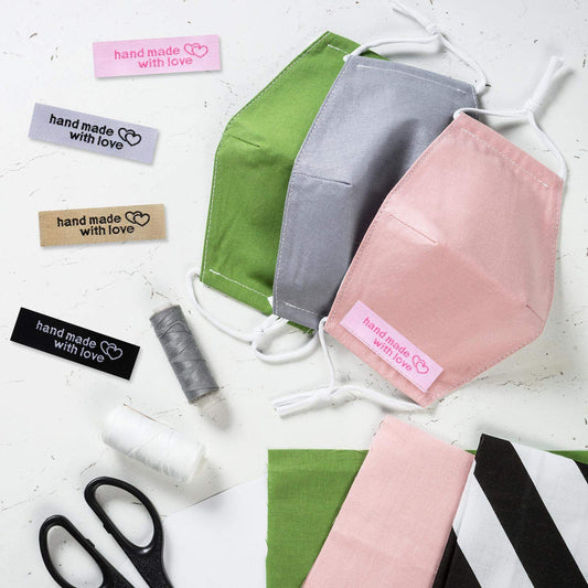 120 Pieces Personalized Sewing Labels Sew on Clothing Labels Handmade Interlocking Heart Pattern Label Tags for Handmade Items Clothes, White, Black, Pink, Brown