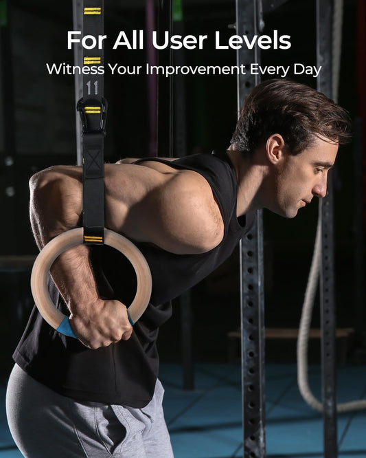 PACEARTH Gymnastics Rings 32mm Wooden Olympic Rings Support 1500lbs Locked Carabiners 9ft Double-Layer Numbered Straps Non-Slip Gym Rings with Foot Straps Door Anchor for Home Gym Full Body Workout