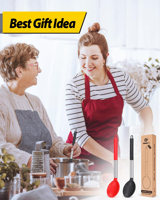 Pack of 2 Large Silicone Cooking Spoon Non Stick Solid Basting Spoons Heat-Resistant Kitchen Utensils for Mixing Serving (Black-Red)