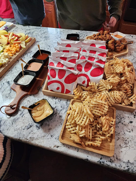 PAFREWOG Bamboo Serving Trays Charcuterie Platter 16.5"x11.8"(42x30cm with Handle, Set Includes 1xHexagon 12.5"(32cm)+1xSquare 7.8"(20cm)+1xSquare 5.9"(15cm) Small Plates for Family Dinner