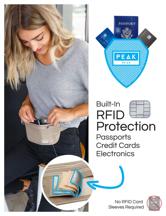 Peak Gear Travel Money Belt. Premium Quality Travel Wallet with RFID Blocking Fabric to Protect Credit Cards, Passports and Documents. Exclusive Theft Protection and 2 Recovery Tags | Gray