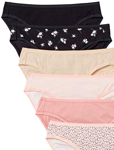 Amazon Essentials Women's Cotton Bikini Brief Underwear (Available in Plus Size), Pack of 6, Ditsy Floral/Floral/Mini Stripe/Multicolor, Large
