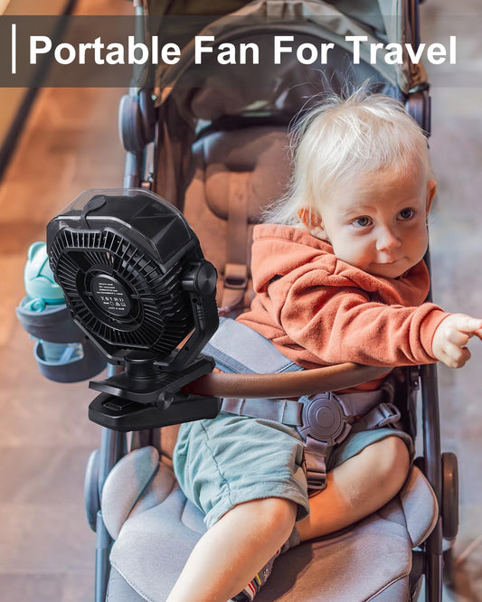 Portable Stroller Mini Fan, Small Rechargeable Personal Fan, Baby Travel Essentials for Wagon, Car Seat, Treadmill, Battery Powered Biking Gear Accessories, 360° Rotation, 3-Speed, Display, Black