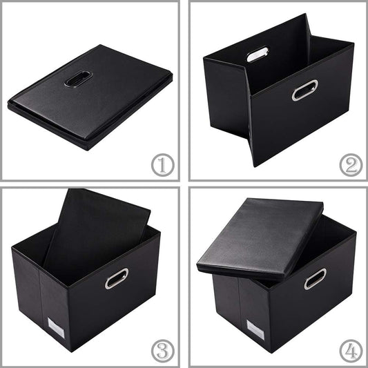 PRANDOM Collapsible Storage Bins with Lids [3-Pack] Leather Fabric Foldable Storage Boxes Organizer Containers Baskets Cube with Cover for Bedroom Closet Office Nursery Black (14.9x10.8x10)