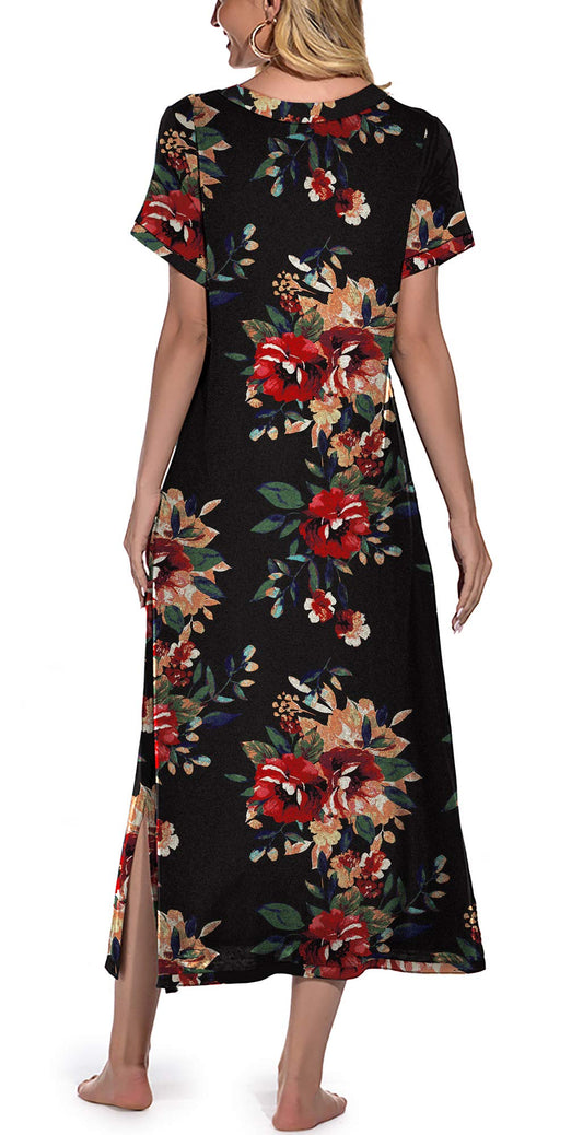 PrinStory Womens Long Nightgown Short Sleeve Nightshirt V-Neck Soft Loungewear Casual Sleepwear With Pockets FP-Brown Black-Medium