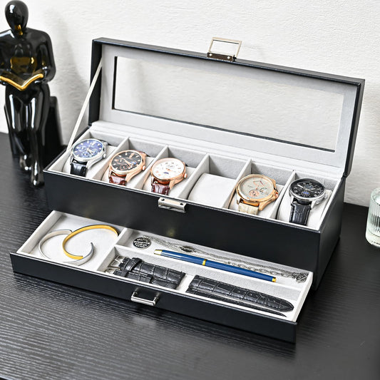 ProCase Watch Box for Men, 6 Slot Watch Display Case with Drawer, Mens Watch Case With Glass Lid, 2-Layer Jewelry and Watch Storage Watch Holder Organizer for Men Women -6 Slot, Black