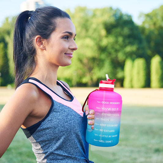 QuiFit Motivational Gallon Water Bottle - with Straw & Time Marker BPA Free Large Reusable Sport Water Jug with Handle for Fitness Outdoor Enthusiasts Leak-Proof (Pink/Blue,1 gallon)