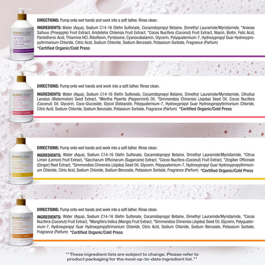 RAW SUGAR Hand Wash Variety Bundle - Lemon Sugar, Watermelon + Fresh Mint, Pineapple + Maqui Berry + Coconut & Raw Coconut + Mango, Formulated without Sulfates & Parabens (16.9 fl. oz, Pack of 4)