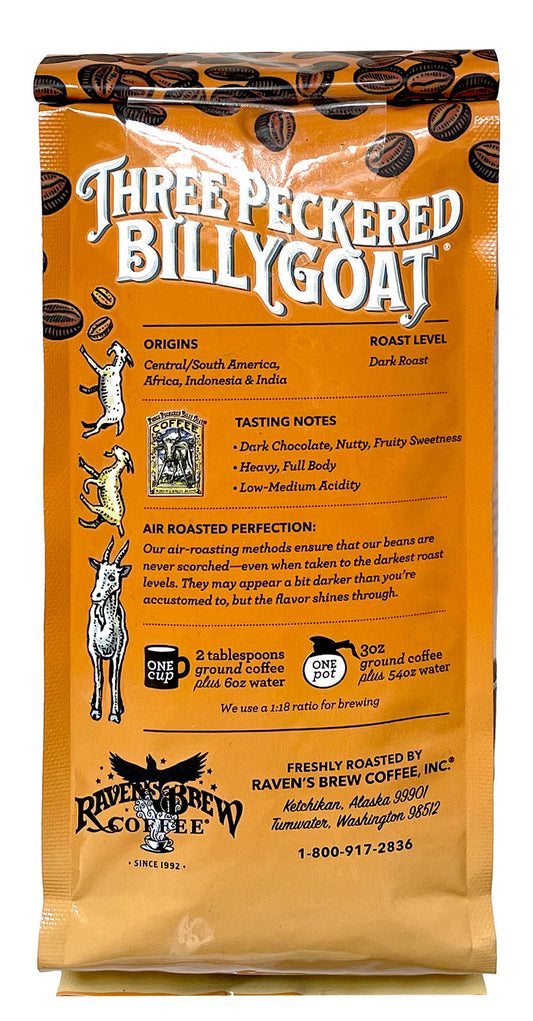 Raven's Brew Coffee Three Peckered Billy Goat, 12 Ounce - Dark Roast - Full Body with a Long Sweet Finish (Whole Bean, 12 oz)
