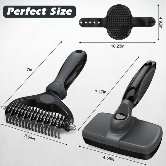 3PCS Self Cleaning Slicker Brush & Pet Grooming Rake & Bath Brush for Dogs and Cats | Double-Sided Dematting Pet Comb & Skin Friendly Deshedding Grooming Tool | Premium Pet Supplies(Gray Black)
