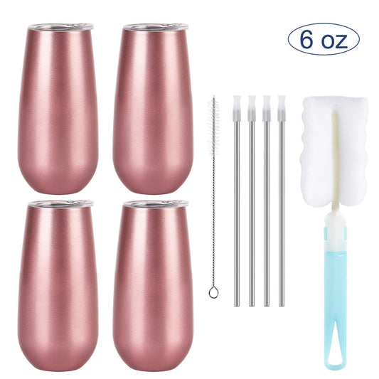 4 Pack Stemless Double Insulated Champagne Flute Tumbler with Lid, 6 Oz Unbreakable Reusable Cocktail Champagne Toasting Glasses, Great Gift for Friends Family Christmas Birthday, Rose Gold