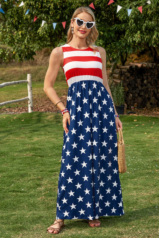 4th of July Stars and Stripes Sundress Patriotic Casual Sleeveless Maxi Dress American Flag M