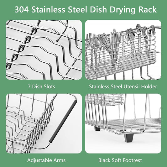 Fanbsy Large Dish Drainer Rack in Sink Adjustable, Expandable 304 Stainless Steel Metal Dish Drying Rack Organizer with Stainless Steel Utensil Holder Over Inside Sink Counter, Rustproof