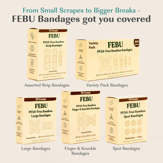 FEBU Eco-Friendly Bamboo Fabric Bandages | PFAS Free Flexible Fabric Bandages | Natural Hypoallergenic Bandage for Scrapes, Cuts & First Aid | Fully Compostable, Latex Free Bandage | 75 Count Strip