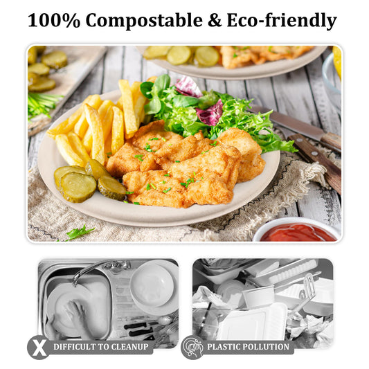 FEHHTO Compostable Paper Plates Set, 250PCS Disposable Heavy-Duty Sugarcane Plate and Eco-Friendly Utensil Biodegradable Dinnerware Plates, Extra Long Forks & Knives & Spoons for Party