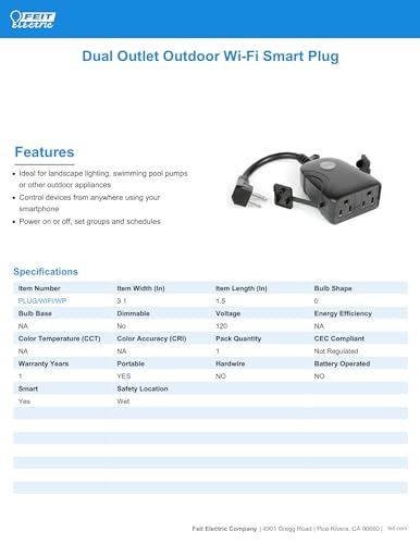 Feit Electric Smart Outdoor Plug, WiFi Waterproof Plug, 2 Grounded Sockets, Works with Alexa and Google Assistant, App Controlled, 15 Amp Indoor/Outdoor 2 Outlet Plug, Black, Plug/WiFi/WP