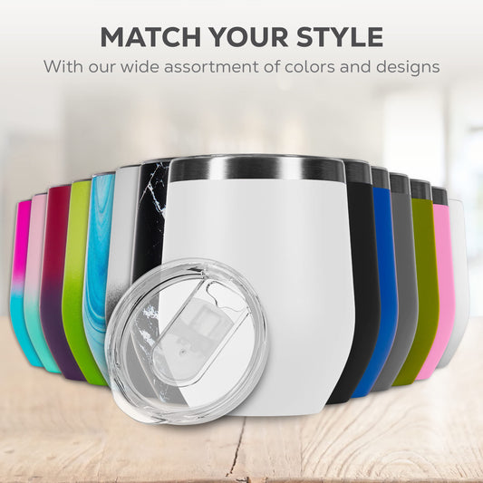 FineDine Triple Insulated Wine Tumbler With Lid (4 Pack) 12oz Stainless Steel Set- Tumblers Keep Drinks Hot & Cold for Outdoors, Beach, Picnics- Unbreakable Glasses With BPA Free Lids (White/Black)