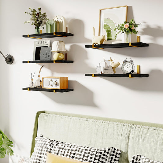 Fixwal Floating Black Gold Shelves Set of 5, Width 4.7 Inches, Rustic Wood Wall Storage Shelves for Bedroom, Living Room, Kitchen, Bathroom, Home Decor, Laundry Room, Office and Plants