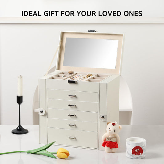 Frebeauty Large Jewelry Box,6-Tier PU Leather Jewelry Organizer,Multi-functional Storage Case with Mirror,Accessories Holder with 5 Drawers for Necklace Bracelets Watches(Pearl White)