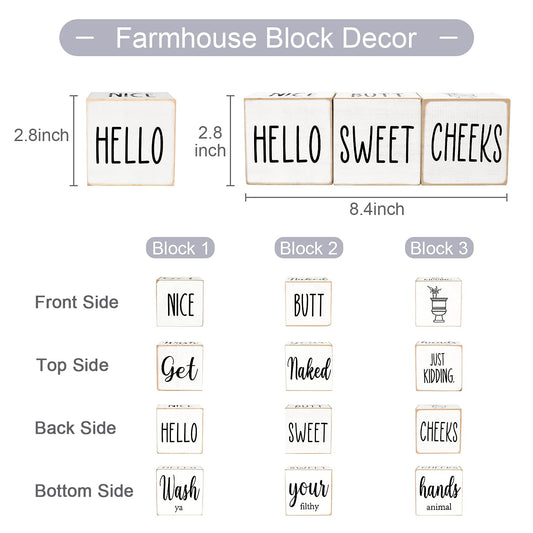 Funny Farmhouse Bathroom Decor and Accessories for Shelf, 4-Sided Wooden Blocks - Nice Butt&Get Naked&Hello Sweet Cheeks&Wash Your Hands Sign, Modern Rustic Restroom Decorations, White 2.8"