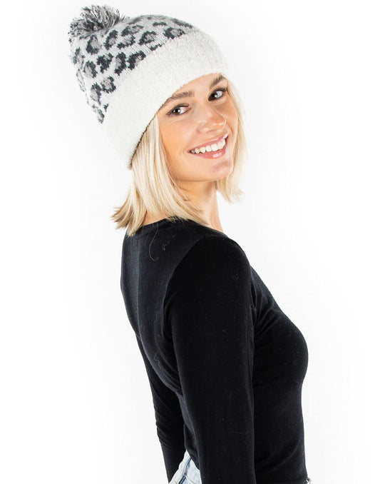 Funky Junque Hat Leopard Print Beanie with Faux Fur Pom Cheetah Knit Cap for Women - a Leopard Print Pom Beanie - Snow Leopard