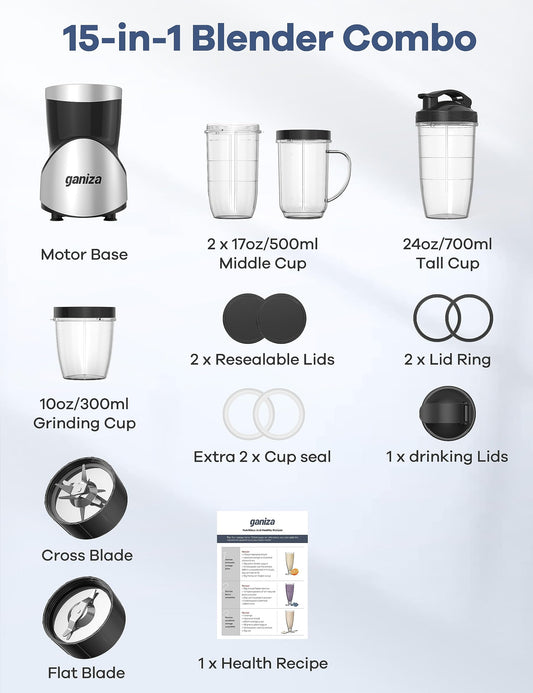 Ganiza Smoothie Blender, 900W Blenders for Shakes and Smoothies, 15-Piece Personal Blender and Grinder Combo for Kitchen, Smoothies Maker with 4 BPA-Free Portable Cup, Nutritious Recipe