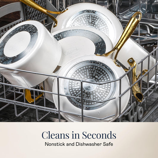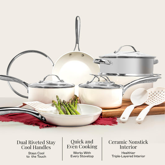 Gotham Steel 15 Pc Ceramic Cookware Set, Ceramic Pots and Pans Set Non Stick with Cooking Utensils and Steamer, Non Toxic PFOA PFOS Free, Premium Gold Stay Cool Handles, Oven & Dishwasher Safe