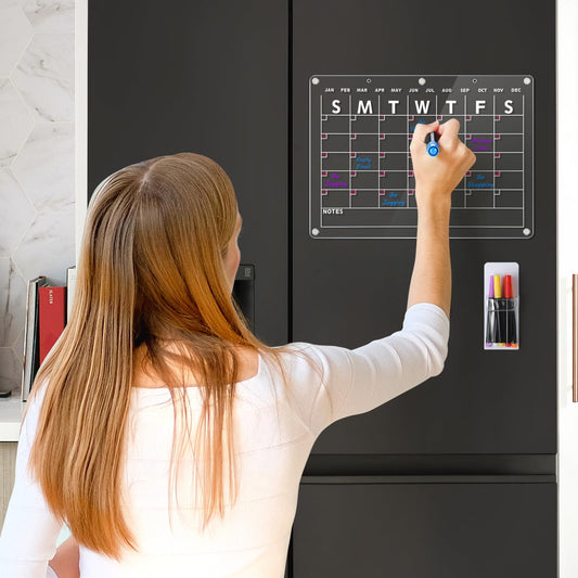 Acrylic Magnetic Dry Erase Board Calendar for Fridge, 16.5"x12" Inch Clear Dry Erase Calendar for Refrigerator, Magnetic Planning Calendars Includes 6 Colors Markers and Magnet Pen Holder