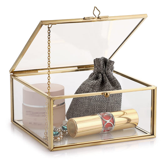 Hipiwe Vintage Glass Jewelry Organizer Box - Golden Metal Keepsake Box Desktop Jewelry Organizer Holder, Wedding Birthday Gift, Square Vanity Decorative Box for Dresser,Bathroom