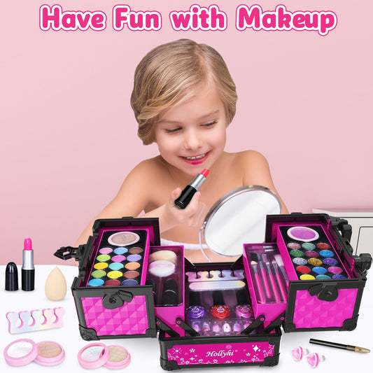 Hollyhi 59 Pcs Kids Makeup Kit for Girl, Washable Play Makeup Toys Set for Dress Up, Pretend Beauty Vanity Set with Cosmetic Case Birthday Toys for Girls 3 4 5 6 7 8 9 10 11 12 Year Old Kids Toddlers