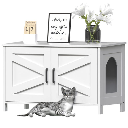 Homhedy Cat Litter Box Enclosure, Wooden Cat Washroom Furniture with Barn Door, Pet House, Fit Most of Litter Box, White