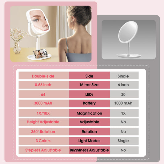 Horyliin Makeup Mirror with Lights - 10x/1x Magnifying Mirror with Light, Rechargeable Desk Mirror with 3-Color Lighting & Memory Function, 360° Adjustable Table Mirror, Gift for Women (White)