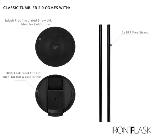IRON °FLASK Camping & Hiking Hydration Flask with 3 Lids - Stainless Steel, Double Walled & Vacuum Insulated Water Bottle - Leak Proof & BPA Free (Midnight Black, Straw - 40 oz)