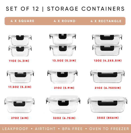JoyJolt 24pc Borosilicate Glass Storage Containers with Lids | 12 Airtight/Freezer Safe Food Storage Containers for Pantry and Kitchen | Meal Prep Container for Lunch | Glass Tupperware Set