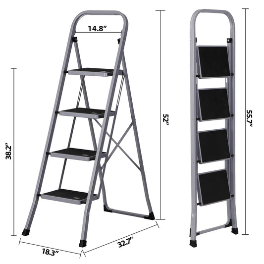 JungleA Step Ladder, Folding 4 Step Stool Ladder for Adult, w/Wide Anti-Slip Pedal, 330 lbs Load Capacity, Foldable Portable Sturdy Lightweight Tall Ladder for Closet, Kitchen, Office & Home, Grey