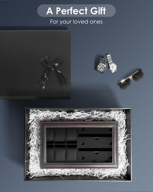 Kukikan Watch Jewelry Box Organizer, 6-Slot 2-Layer Watch Case and Sunglasses Storage with Large Glass Lid, Men's Jewelry Box with Lock, Watch Holder Display Case, Gift for Men Women