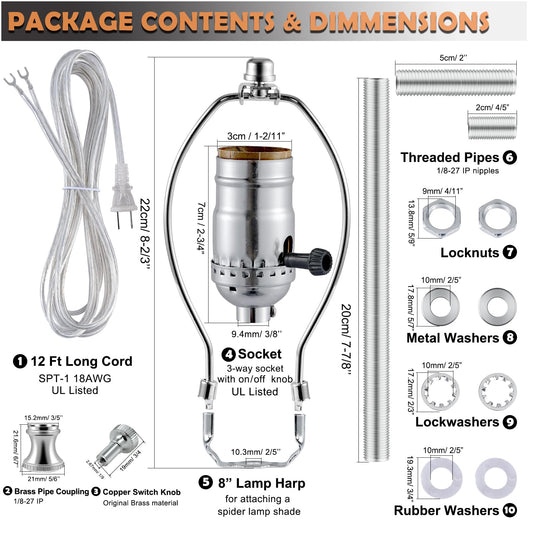 Lamp Making Kit,Make a Lamp or Repair Kit,3-Way Lamp Socket with Matching Cord Lamp Harp Set,Lamp Wiring Kit for Table Floor Lamp,Essential Hardware for DIY Lamp Design or Repair (Silver, 1)