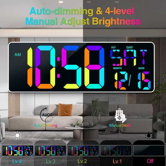 Large Digital Wall Clock Large Display 17.2" Big Digital Timer with 9 Groups Timer Remote Control for Gym Classroom 10 Colors Available for LED Wall Clock with Temperature Date Week DST Dynamic RGB